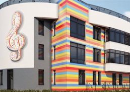 В здании детсада на территории жилого комплекса от застройщика «Ленстройтрест» завершены фасадные работы и стартовала отделка. На одном из фасадов появился красивый скрипичный ключ - символ как образовательного учреждения, так и всего жилого квартала.