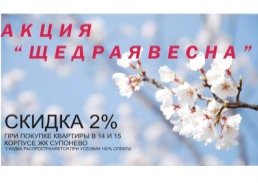 16 и 17 апреля застройщик вводит новую акцию «Щедрая весна», по условиям которой приобрести квартиру в 14-м или 15-м домах ЖК «Супонево» в указанный период можно с 2%-ной скидкой.